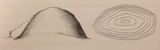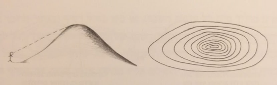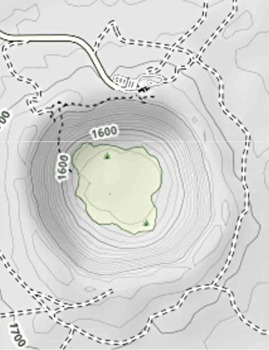 פסגת ההר, יופיע במפה כמעגל סגור (שטח שבו ארבעה כיוונים יורדים).