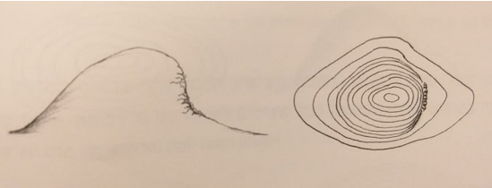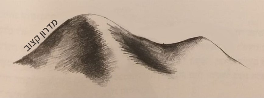 המדרון מתון יותר בבסיסו, כלומר על המפה קווי הגובה מרווחים יותר בבסיס ונעשים צפופים עם העלייה בגובה.